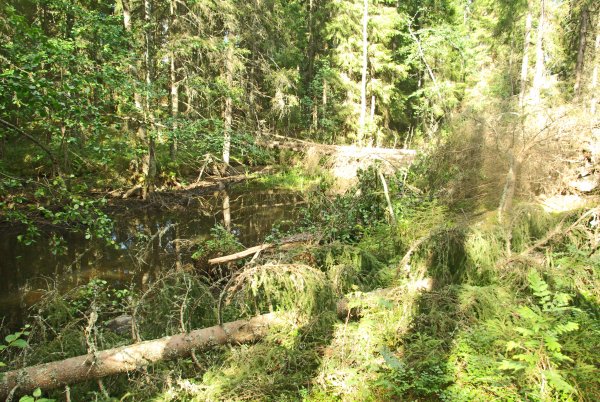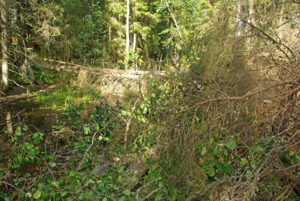 ![]() Helena myrskyn kaatamia puita oli runsaasti, joten kulkeminen ojan reunustaa pitkin oli paikoitellen estynyttä |
