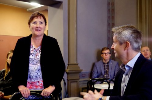 ![]() Porin kaupunginjohtaja Aino-Maija Luukkonen kertoi tilaisuuden aluksi Porin ja teatterin historiaa ja toivotti tervetuloa Poriin tutustumaan messualueelle ja seuraavana vuotena messuille. |