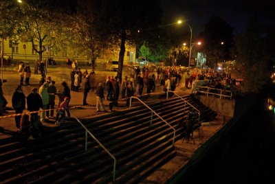 ![]() Yleisöä oli saapunut Etelärantaan ja veneisiin, muutama tuhat henkilöä, pilvinen mutta sateeton sää auttoi tulien näyttävyyttä. |