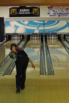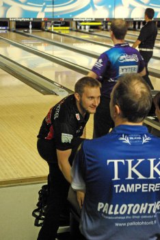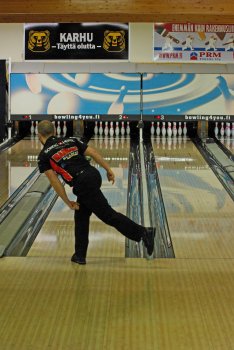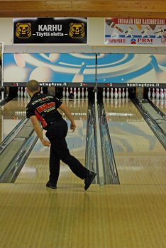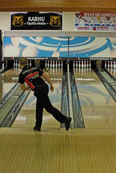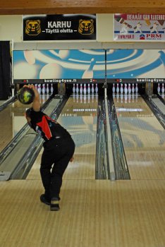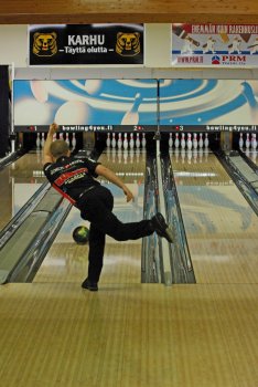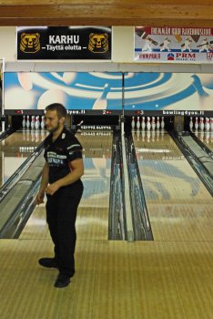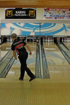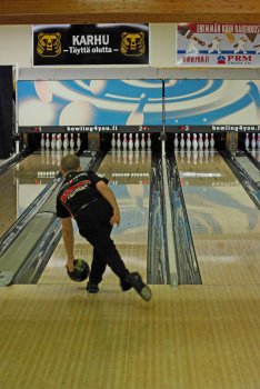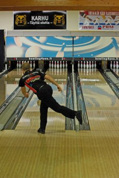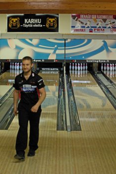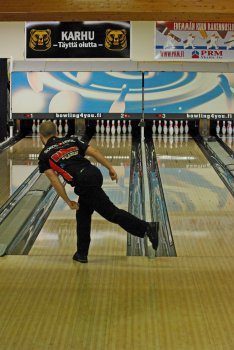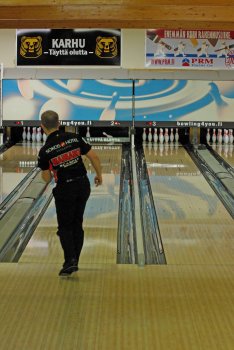 Todettakoon, että Joonas Jehkinen aloitti finaalit samalla rataparilla (1-2) kuin alkukarsinnatkin ja heitti samoin täyden 300 sarjatuloksen. Kuten kuvasarjasta voidaan todeta; Seiska keila oli jäädä pystyyn, näin myös Joonas oletti. Kuitenkin 1 keila tuli seinämän kautta ja kaatoi keilan. |