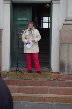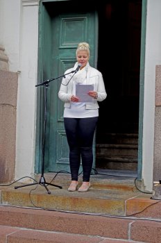 ![]() Kaupunginvaltuuston puheenjohtaja Diana Bergroth-Lampinen puheessaan muisteli Raatihuoneen historiaa ja antoi tunnustusta kansalaisaktiivisuudelle, joka johti patsaiden saattamiseksi kuntoon, sekä kiitti kunnostukseen osallistujia. Erittäin mielenkiintoinen ja liikuttava puhe. |