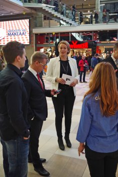 | Kauppakeskuksen johtaja Pasi Välimaa ja henkilökunta avajaistohinoissa. | ||