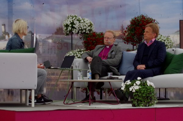 ![]() Arkkipiispa Kari Mäkinen ja kansanedustaja Mauri Pekkarinen haastattelussa |