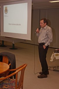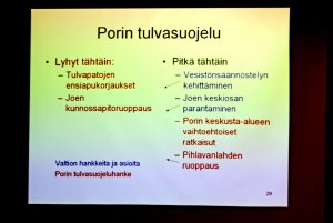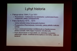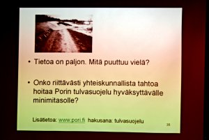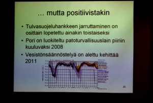 ![]() Porin tulvasuojelupäällikkö Pekka Vuola selvitti Porin tulvakartoituksen tilannetta 7.2.2012 Viikkarin Valkamassa. Tuntuu siltä, että nyt Vuola on päässyt tulvien aiheuttajan alkulähteille. Esityksessään hän totesi; Pitäisi tutkittavan ensin vesistön alkulähteet ja suoritettavan siellä järvien virtaamapäästöjen tasaisuudet. |