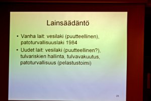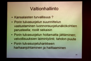 ![]() Lopuksi Vuola esitti kysymyksiä; Mitä puuttuu vielä Onko yhteiskunnallista tahtoa hoitaa tulvasuojelua? Kysymyksiin on helppo vastata; Ei ole toistaiseksi, sen ovat osoittaneet aiemmin laaditut tulvakartoitukset ja YVA selvitykset. |