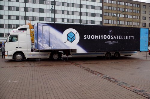![]() Aalto- yliopiston opiskelijat rakentavat satelliitteihin erilaisia mittaus- ja tutkimuskomponentteja. Suomi100vuotta kunniaksi on rakennettu rekka-autoon esittely eri rakennetuista satelliiteista, sekä myös Suomi100Satelliitti, joka lähetetään esittelykiertueen päättyessä kiertoradalle. |