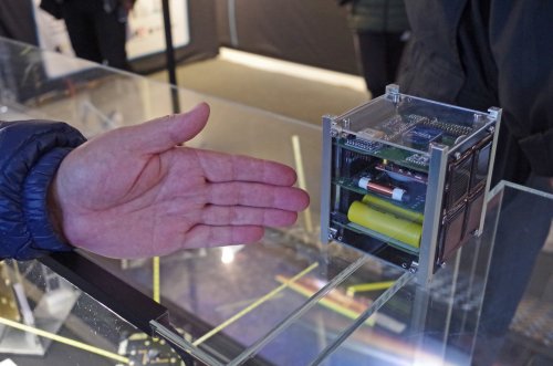 ![]() Maata kiertävälle radalle lähetettävä tutkimuslaite. Laitteen koko vertailussa kämmeneen. |